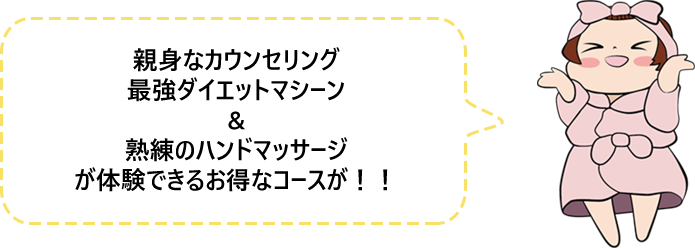 どの部位にどのくらい脂肪がついているかどんな食生活をしているかなどをお聞きし具体的な痩身プランを組み立てます。