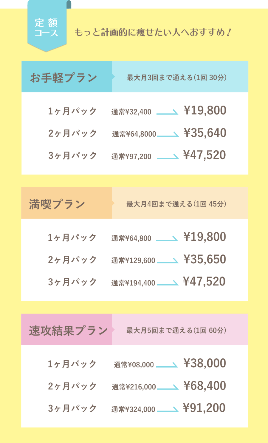 お客様一人一人の体質や通える回数・理想とする数値によって変わってきます。「いつまでに◯◯キロ痩せたい!」「体重よりもシルエットを重視したい」などのご要望をカウンセリング時にお伝えください。あなたの希望をできる限り叶えさせて頂きます。